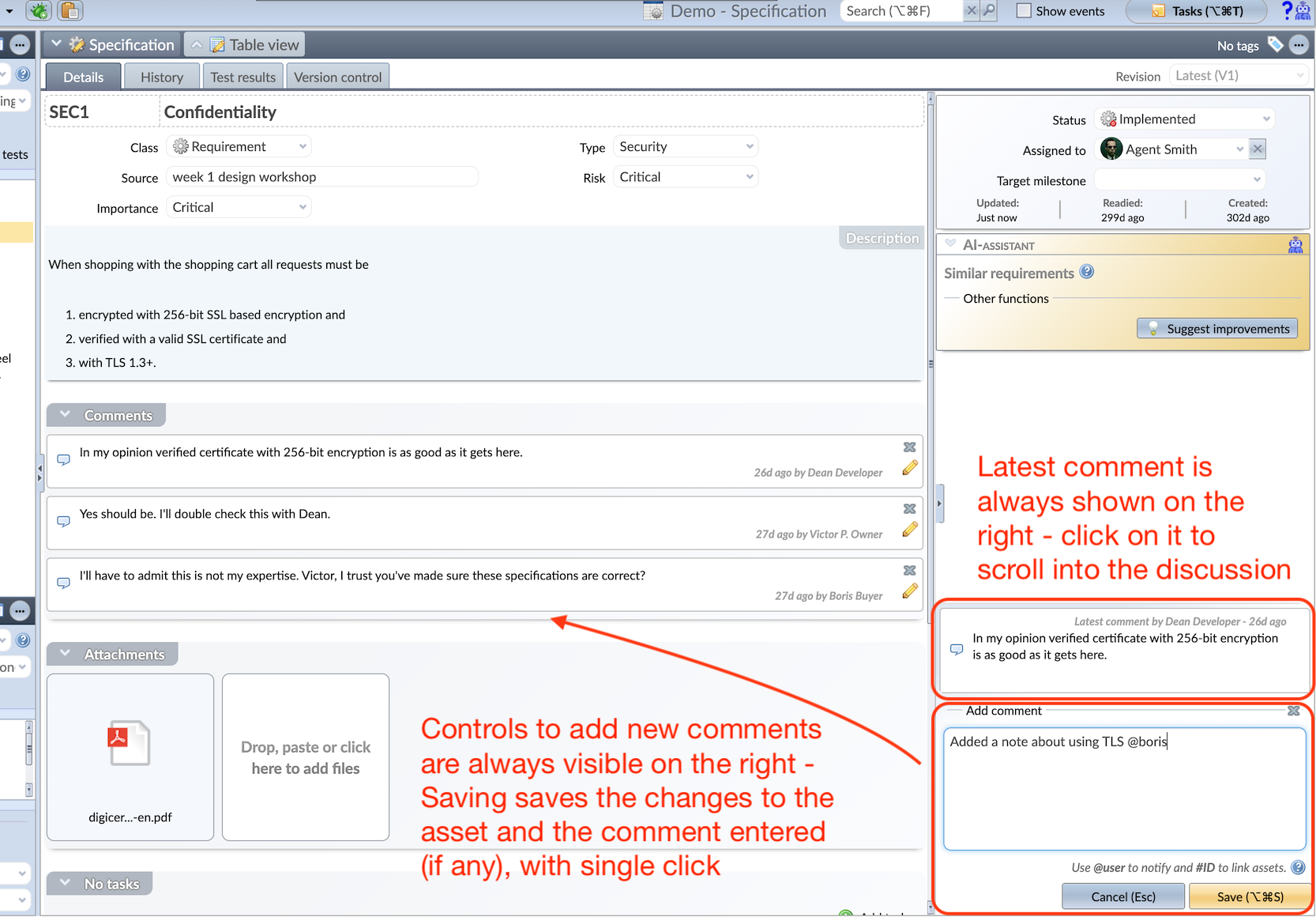 - New comments are entered with controls on top of the Cancel and Save buttons, and the entered comment (if any) is always saved with other changes with a single click.