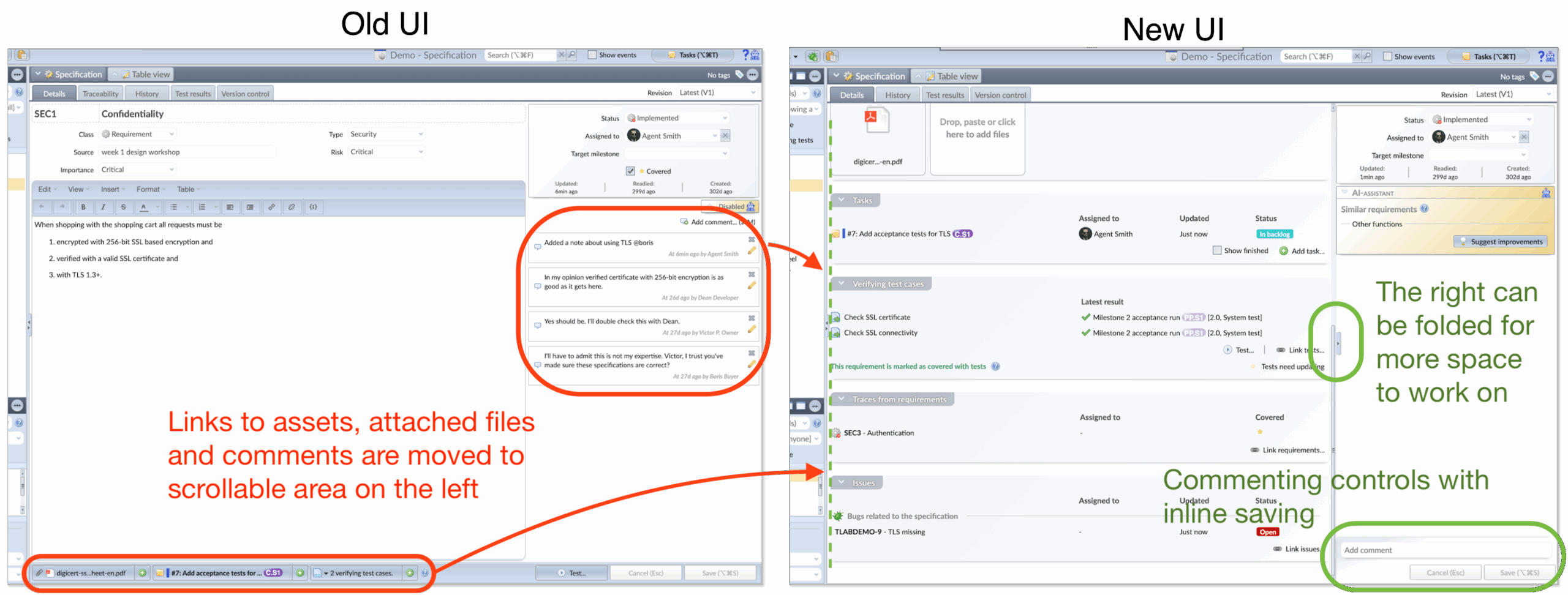 As said above, the comments (in the specification, for issues, and for test cases) are now shown in their own foldable panel in the left-hand side scrollable area. In this new way to present comments,