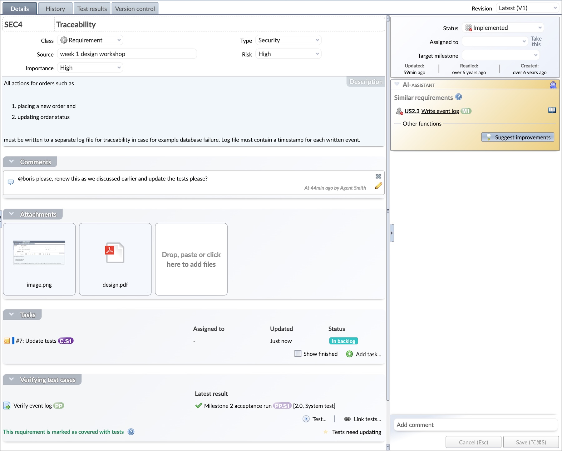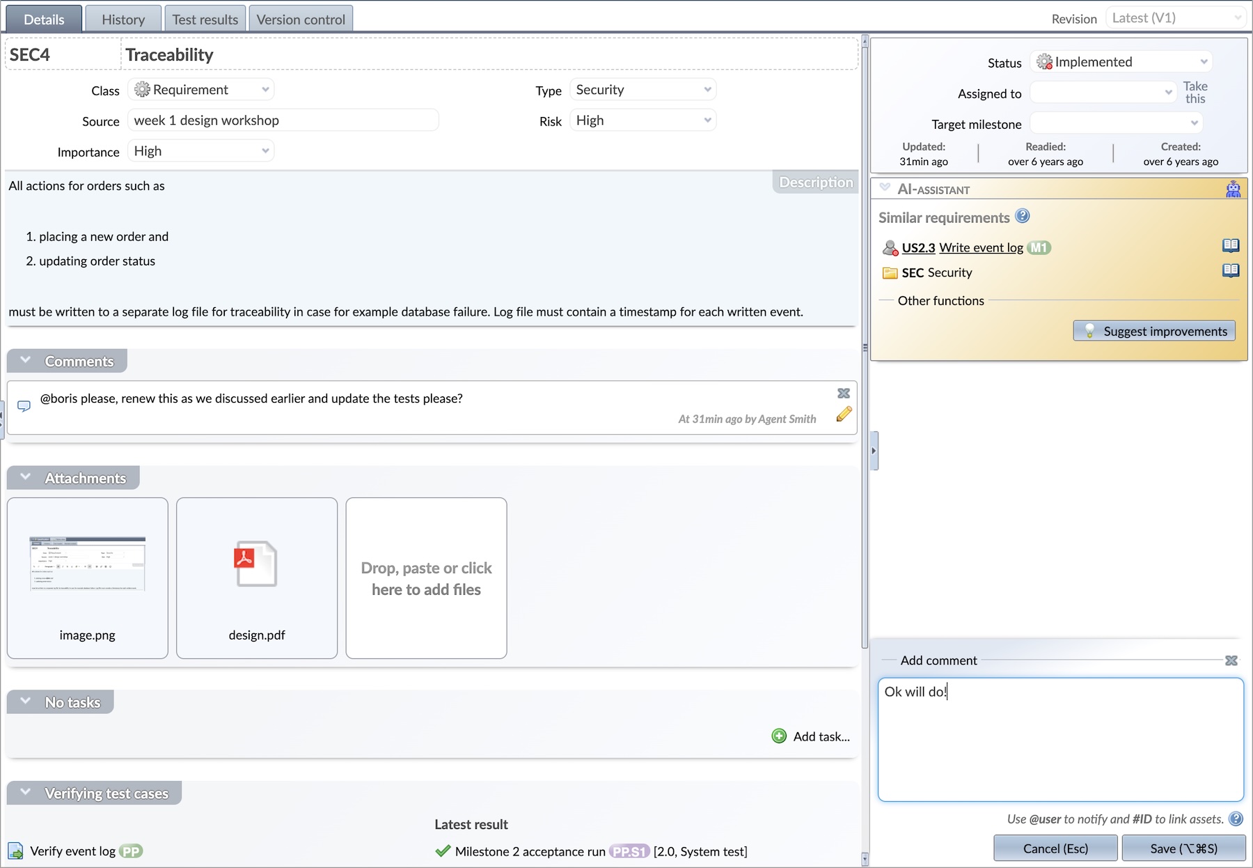 - When you edit assets (for example, test cases in your test library), you can now easily add comments at the same time: just enter your comment and click Save to save your changes to the asset and add the comment.
