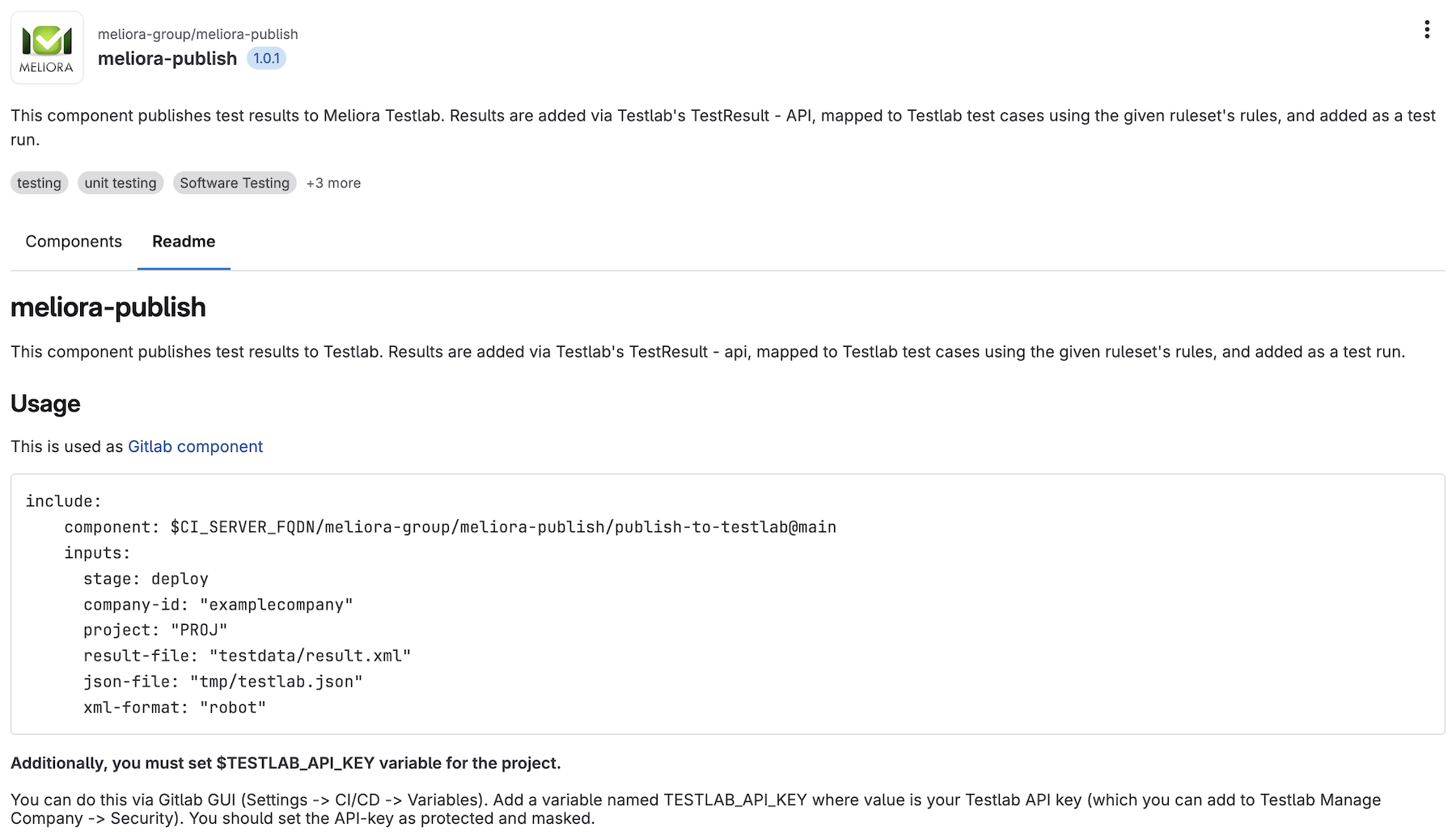 GitLab’s CI/CD catalog has been added with an integration component to integrate your GitLab with your Testlab project. You can use this component in your GitLab Pipelines to publish the results of automated tests to your Testlab project. The component supports publishing results from JUnit and Robot Framework formats.
